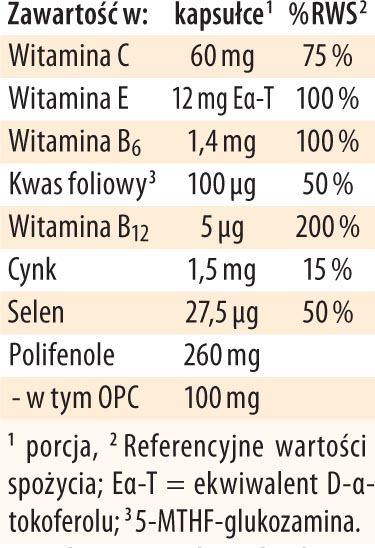 ekstrakt z winogron* (37%), ekstrakt z owoców aceroli* zawierający kwas L-askorbinowy (29%), hydroksypropylometyloceluloza (kapsułka roślinna), witamina E, ekstrakt z zielonej herbaty* (4,3%), witamina C, sole magnezowe kwasów tłuszczowych – substancja przeciwzbrylająca, glukonian cynku, substancja przeciwzbrylająca: dwutlenek krzemu, ekstrakt z kory sosny* (0,9%), selenometionina, maltodekstryna, witamina B6 (chlorowodorek pirydoksyny), bioaktywny kwas foliowy (metylowany: 5MTHF-glukozamina), witamina B12 (metylokobalamina).