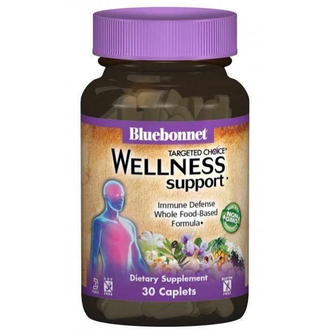 Targeted Choice® Wellness Support firmy Bluebonnet to kompleksowa formuła, która wspiera odporność immunologiczną organizmu. Zawiera komplementarną kombinację składników odżywczych (nie zawierają one GMO) oraz ekstraktów ziołowych pochodzących z ekologicznych źródeł. Produkt stanowi źródło witamin A, C, D3, Cynku, N- acetylocysteiny, kwercetyny, bromelainy oraz ekstraktów z brodziuszki wiechowatej, czosnku pospolitego, kurkumy, traganka błoniastego, czarnego bzu, oliwki europejskiej oraz pokrzywy zwyczajnej. Produkt nie zawiera mleka, jajek, ryb, orzechów, pszenicy, soi, jęczmienia, drożdży, glutenu, sodu oraz cukru.