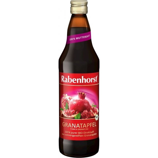 Waga produktu: ok 1,260 kg Certyfikat: DE-ÖKO-024 Właściwości: Sok zalecany osobom w każdym wieku, dbającym o swoje zdrowie i prawidłowy sposób odżywiania się. Składniki: 100% sok z owoców granatowca bio. WARTOŚĆ ODŻYWCZA W 100 g Wartość energetyczna: 260 kJ/61 kcal Tłuszcz: w tym kwasy nasycone: Węglowodany: 14,0 g w tym cukry: 14,0 g Błonnik: Białko: Sól: Sposób spożycia: ok. 40 ml dziennie przez okres kilku tygodni. Po otwarciu przechowywać w lodówce. Opakowanie: 750 ml