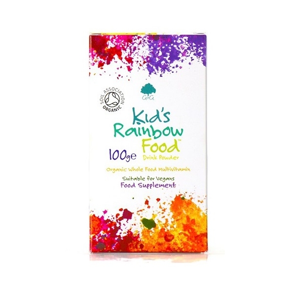 Kid’s Rainbow Food to ekologiczna mieszanka witamin pozyskiwana w 100% z żywności .Produkt zawiera ekologiczne sproszkowane owoce i warzywa, które są źródłem witamin, minerałów i składników odżywczych idealnie uzupełniających dietę dziecka. Formuła dedykowana dzieciom od 4 roku życia