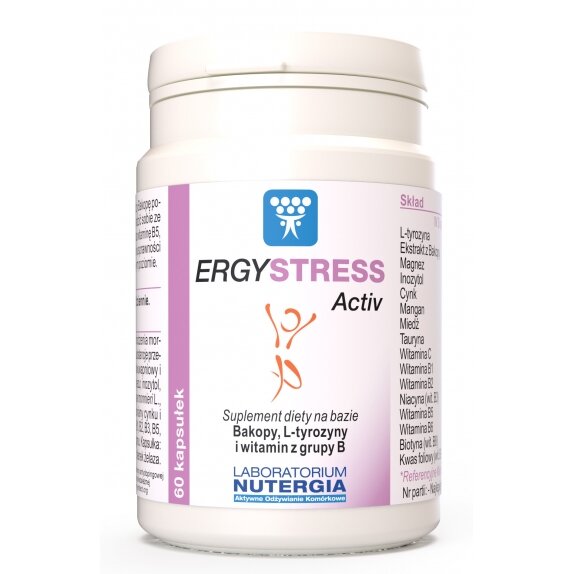 ERGYSTRESS Activ to odpowiednio dobrana kombinacja substancji odżywczych (tyrozyna, tauryna, inozytol, magnez, witaminy B i C, składniki mineralne) i rośliny adaptogennej Bakopa. Posiada ona szereg prozdrowotnych właściwości, do których możemy zaliczyć zmniejszenie skutków stresu i niedostatecznej syntezy dopaminy. Bogaty skład preparatu kompensuje niedobory magnezu i witamin z grupy B, przyczyniając się tym samym do przywrócenia równowagi metabolicznej