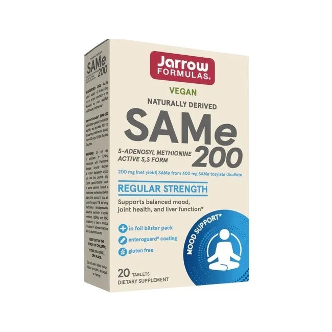 Jarrow Formulas SAMe to suplement diety w skład którego wchodzi S-adenozylometionina. Stanowi ona pochodną adenozyny oraz metioniny i jest substancją naturalnie występującą w organizmie człowieka. Preparat zdecydowanie wyróżnia się na tle pozostałych – zawarta w nim SAMe została wytworzona w naturalnej fermentacji mikrobiologicznej, a następnie przetworzona w niskiej temperaturze i wilgotności, bez użycia środków chemicznych. Do uzyskania 200 mg czystej SAMe użyto aż 400 mg disiarczanu tosynalu SAMe. Dzięki temu końcowy produkt charakteryzuje się znakomitą biodostępnością i zawiera ok.68-80% aktywnego biologicznie enancjomera SAMe (S,S). Co więcej, substancja czynna jest chroniona przed degradacją przez specjalną otoczkę dojelitową, która powleka każdą tabletkę. SAMe pełni istotną rolę we wszystkich podstawowych procesach metabolicznych, dlatego preparat może być klinicznie użyteczny w wielu pozornie nie związanych ze sobą obszarach. Najczęściej jest wykorzystywany w celu usprawnienia procesu detoksykacji i wsparcia funkcji wątroby oraz złagodzenia dolegliwości ze strony układu chrzęstno-stawowego. To również jeden ze skuteczniejszych środków o działaniu przeciwdepresyjnym i prokongnitywnym.