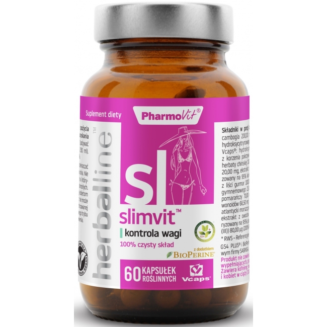 Slimvit™zawiera mieszankę wysoko skoncentrowanych ekstraktów oraz minerałów, zamkniętych w roślinnej kapsułce Vcaps®. BioPerine® -pieprz czarny wspiera trawienie i wchłanianie składnikówodżywczych oraz zwiększa skuteczność składników ziołowych. Garcinia cambogia,gurmar, gorzka pomarańcza oraz kelp są pomocne w kontrolowaniu wagi ciała. Ponadto garcinia cambogia pomaga zmniejszyćuczucie głodu, gurmar pomaga utrzymać prawidłowy poziom cukru oraz ogranicza apetyt. Gorzka pomarańcza wspomaga metabolizm lipidów i węglowodanów, a kelp wspiera regularne wypróżnianie i utrzymuje komfort trawienny. Herbata chińska i pokrzywa indyjskawspierają metabolizm tłuszczów. Kurkuma pomaga w prawidłowym funkcjonowaniu wątroby i przyczynia się do lepszego trawienia tłuszczów. Chrom przyczynia się do utrzymania prawidłowego metabolizmu makroskładników odżywczych.