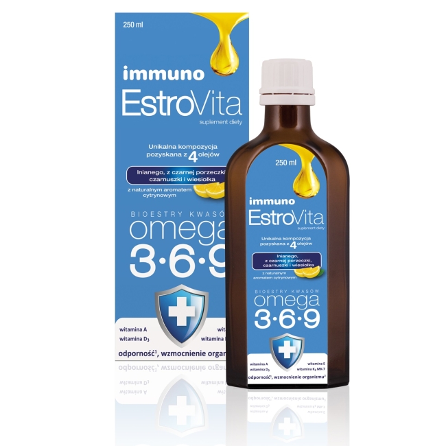 EstroVita Immuno to suplement diety o najwyższej skoncentrowanej zawartości kwasów tłuszczowych omega -3, -6, -9 wyizolowanych z unikalnej mieszaniny aż 4 olejów roślinnych (lnianego, czarnej porzeczki, czarnuszki oraz wiesiołka). EstroVita Immuno zwiera starannie dobraną kompozycję kwasów tłuszczowych z grupy Omega-3/Omega-6 w doskonałej proporcji Omega-3/Omega-6 oraz kompleks witamin A, D, E, K