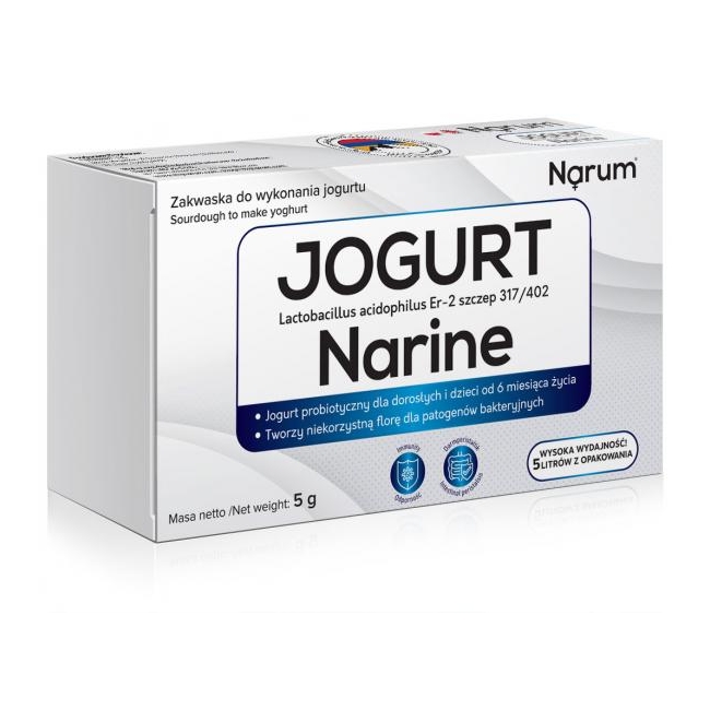 Jedno opakowanie zawiera 5 jednostek suchego fermentu w celu przygotowania pięciu porcji jogurtu z 1 litra mleka każda.
