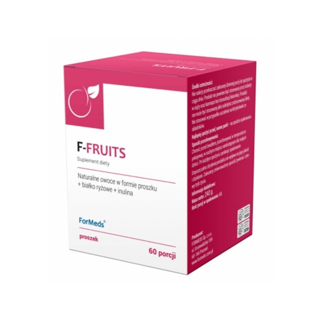 F-FRUITS to suplement diety w postaci proszku. Zawiera mieszankę sproszkowanych soków owocowych, m.in. z owoców jagody i czarnej porzeczki. F-FRUITS zawiera również wysoką ilość błonnika (inulina) oraz białka (białko ryżowe o wysokiej zawartości aminokwasów).