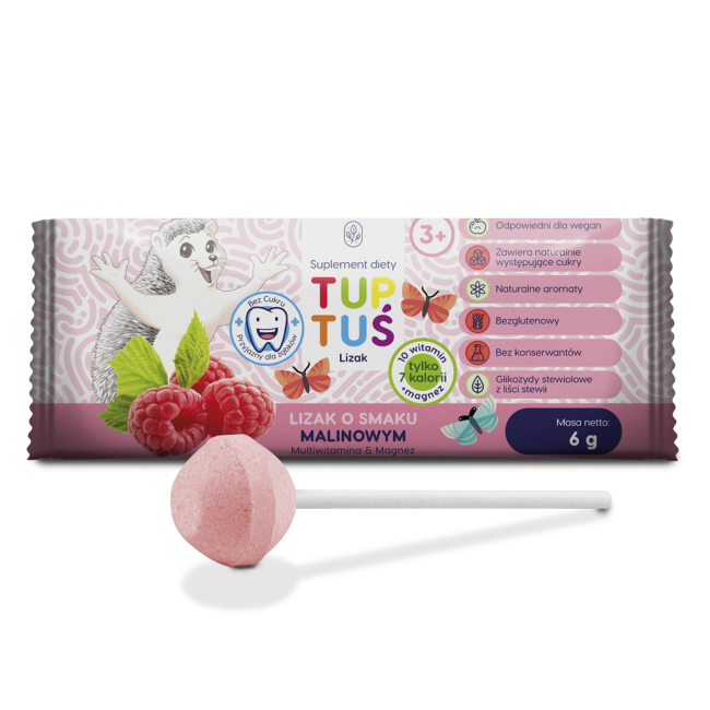 Lizaki pudrowe Tuptuś to produkt zawierający suszone maliny połączone z witaminami i magnezem. Lizaki te o smaku malinowym przeznaczone są do uzupełnienia codziennej diety dzieci powyżej 3 roku życia oraz dorosłych w składniki aktywne ważne dla prawidłowego funkcjonowania organizmu. Co ważne do produktu nie dodano cukrów oraz składników pochodzenia zwierzęcego, więc może on być stosowany także przez wegan.
