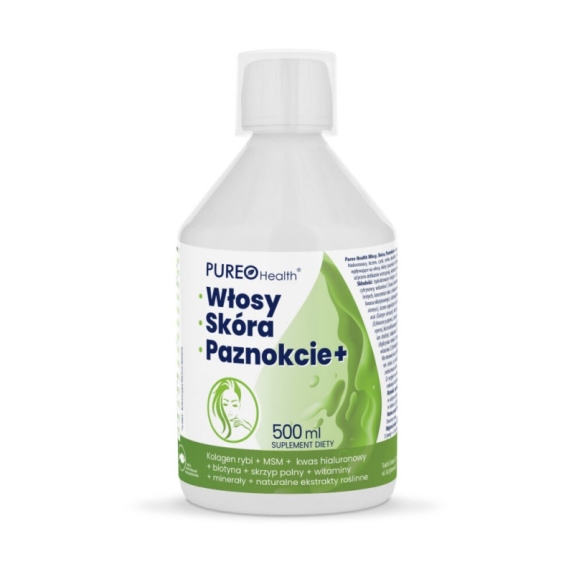 Pureo Health Włosy Skóra Paznokcie+ to suplement diety w płynie o smaku owocowym, zawierający w swoim składzie hydrolizowany kolagen rybi, biotynę, MSM, kwas hialuronowy, krzem, cynk, selen, ekstrakt z ziela skrzypu polnego, witaminy, minerały oraz naturalne składniki roślinne. Zawiera substancje słodzącą. Produkt dla osób dorosłych