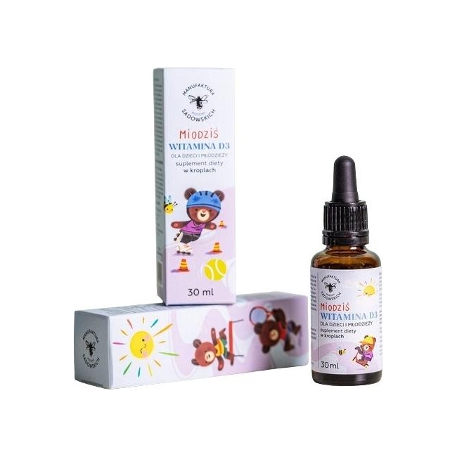Oto jest - witamina D prosto od Miodzisia! Nasz mądry miś niezwykle cieszy się z letnich, słonecznych dni, czerpie wtedy moc witamin prosto z natury, ale doskonale wie, że witaminy D potrzebuje przez cały rok! Długo się głowił nad najlepszą i najwygodniejszą formułą, aż w końcu wymyślił - poznajcie witaminę D dla dzieci i młodzieży w kropelkach! Miś specjalnie wybrał na bazę oliwę - tę ze starannie dobranych oliwek, z pierwszego tłoczenia. Jak zawsze dopilnował, żeby jego suplement był najwyższej jakości, bez “E” dodatków. Tak powstały prawdziwe kropelki mocy, dla każdego! Wygodna w stosowaniu formuła sprawia, że witaminę D można w łatwy sposób podawać zarówno niemowlakom, jak i starszakom! Wszystko w trosce o zdrowy rozwój i wsparcie naturalnej odporności przyjaciół Miodzisia!