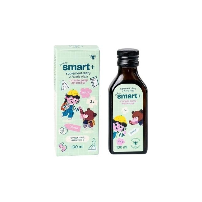 Każda porcja SMART+ to połączenie kwasów Omega 3, 6 i 9 w najlepszej jakości - z oleju lnianego, z czarnuszki i z migdałów. Dodaliśmy do niego naturalny aromat gumy balonowej, dzięki czemu dzieci chętnie sięgają po swoją codzienną porcję zdrowia!