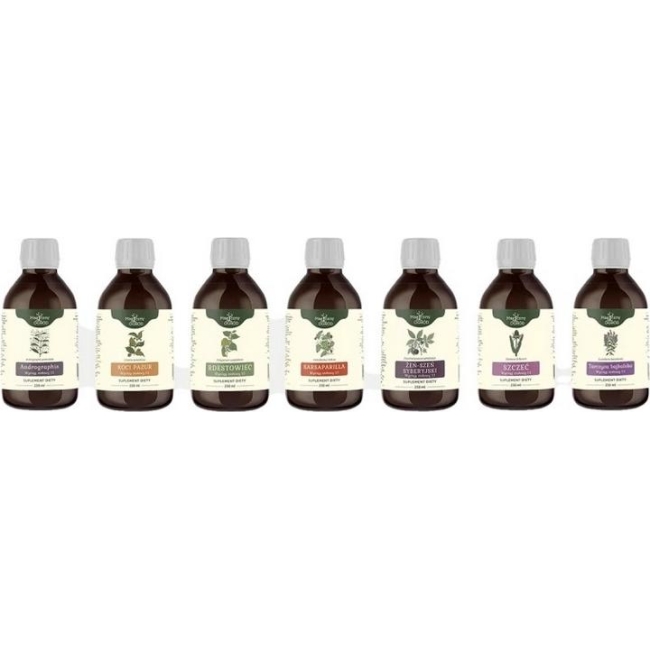 Nalewki wprowadzamy sukcesywnie po jednej co 3-4 dni, tj. na początek rdestowiec 2 razy dziennie, następnie czwartego dnia dołączamy koci pazur 2 razy dziennie, ósmego dnia andrographis, dalej sarsaparilla, żeń-szeń syberyjski, tarczyca bajkalska, szczeć polska.