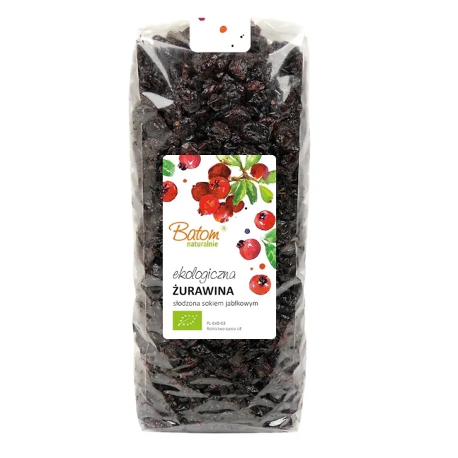 BIO żurawina słodzona sokiem jabłkowym. Ekologiczna żurawina to doskonała przekąska, dodatek do deserów, ciast czy dań mięsnych.