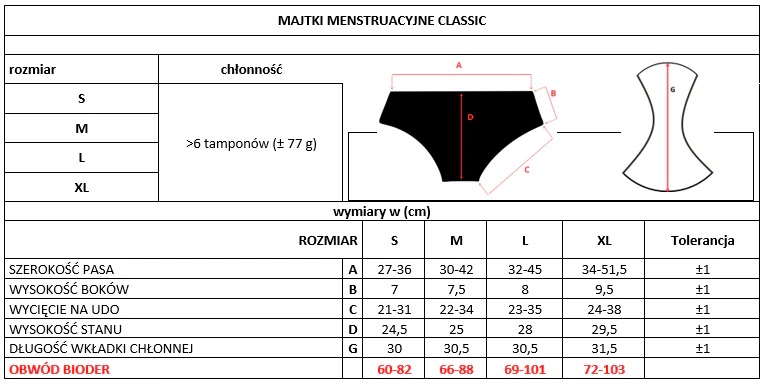UWAGA: ROZMIARY BIELIZNY MENSTRUACYJNEJ, W ZALEŻNOŚCI OD SERII MOGĄ SIĘ NIECO RÓŻNIĆ, DLATEGO, JEŻELI TWOJE WYMIARY ZNAJDUJĄ SIĘ NA GRANICY DWÓCH ROZMIARÓW, NP. S i M, POLECAMY WYBÓR WIĘKSZEGO ROZMIARU.