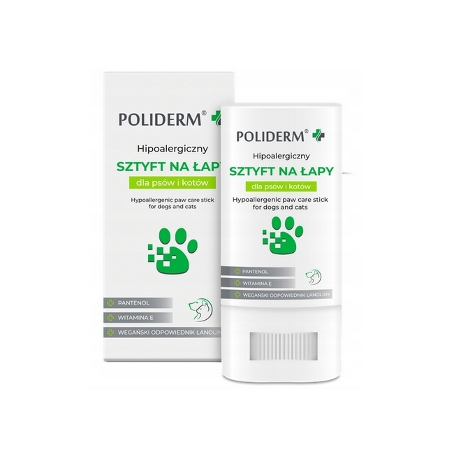 POLIDERM® SZTYFT NA ŁAPY posiada kojąco-regenerującą formułę, dzięki której łagodzi podrażnienia, nawilża skórę oraz tworzy na niej ochronną warstwę przeciw działaniu czynników zewnętrznych.