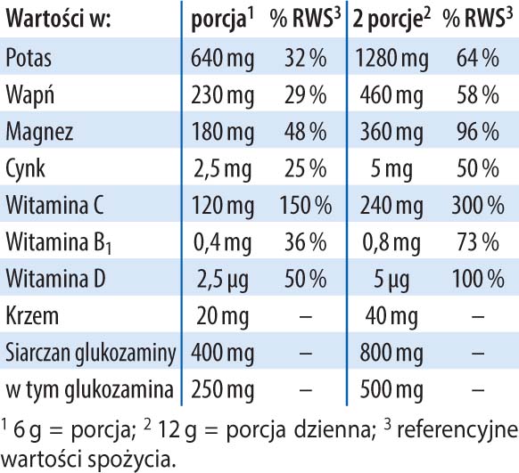 cytrynian potasu, mleczan wapnia, sole magnezowe kwasu cytrynowego (cytrynian magnezu), siarczan glukozaminy (8,7%), sproszkowany owoc czarnej porzeczki (5,2%), sproszkowany owoc żurawiny (3,5%), sproszkowany owoc dzikiej róży (3,5%), kwas l-askorbinowy (witamina C), regulator kwasowości: kwas jabłkowy, węglan magnezu, dwutlenek krzemu, naturalny aromat owocu czarnej porzeczki, substancja słodząca – glikozydy stewiolowe, cytrynian cynku, chlorowodorek tiaminy (witamina B1), cholekalcyferol (witamina D3 z porostów).